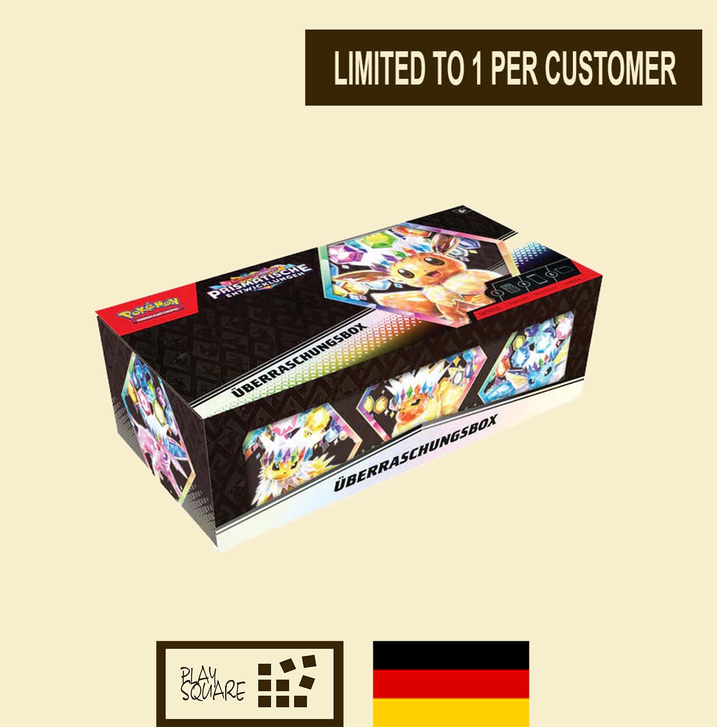 In der Überraschungsbox befindet sich eine zufällig ausgewählte holografische Promokarte mit Evoli-ex oder einer seiner Entwicklungen: Flamara-ex, Blitza-ex, Aquana-ex, Feelinara-ex, Psiana-ex, Nachtara-ex, Glaziola-ex oder Folipurba-ex. Diese Karten entsprechen den Versionen aus der Erweiterung, sind jedoch mit einem exklusiven Stempel des Setlogos versehen. Zusätzlich erhalten Käufer vier Boosterpacks aus Prismatische Entwicklungen und eine Aufgewahrungsbox mit vier bunten Trennstegen.